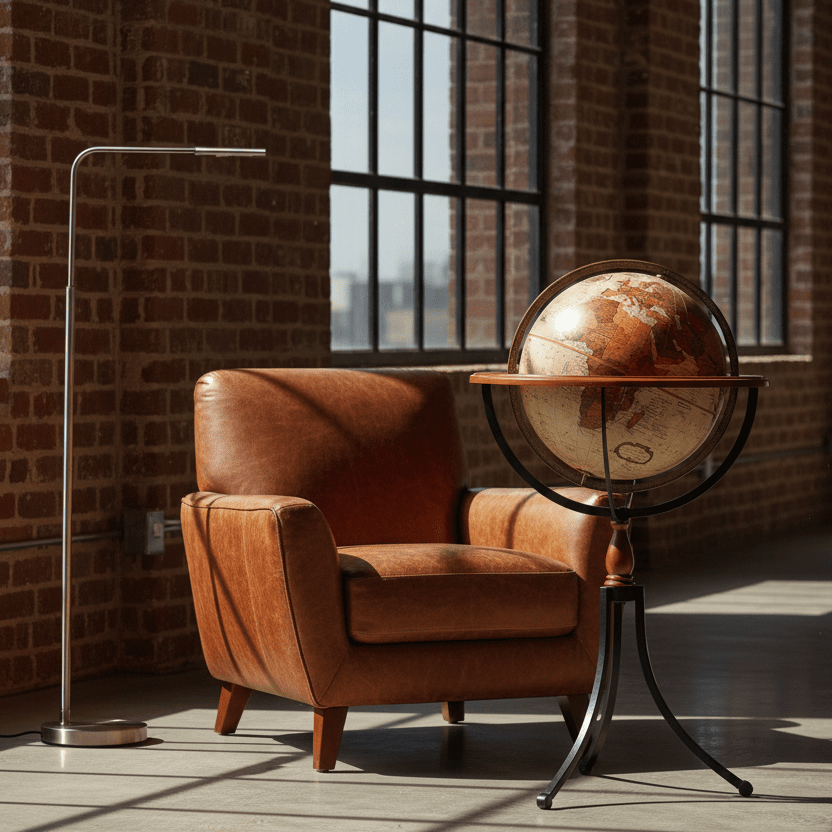 Mixed Materials: The contrast between the warm cherry wood, the industrial matte black iron, and the metallic globe creates a truly singular look.