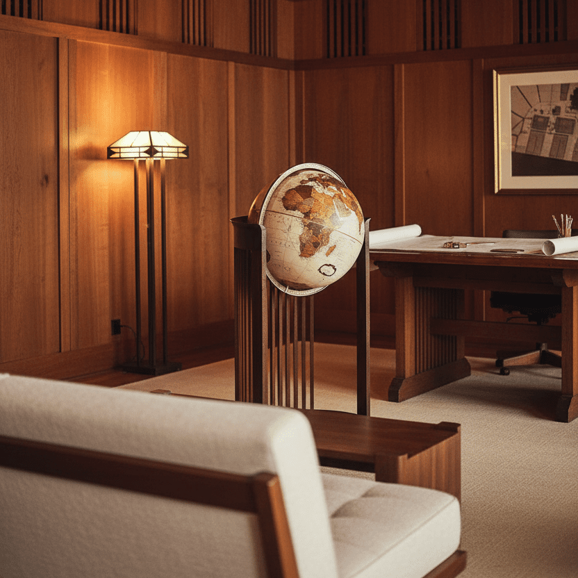The Replogle Barrel is not just a globe; it is a piece of architectural history. Part of the exclusive Frank Lloyd Wright Collection, this stunning floor globe is an adaptation of Wright's famous "Barrel Chair," originally designed in 1903 and later modified for his own home, Taliesin, and the Wingspread estate. It is a conversation piece that brings the genius of America's greatest architect into your home or office.